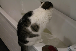 Kyllä tuo kylpyvesi oli valumassa ihan minua varten :D Asterix istuskeli ammeen vieressä kylpyni ajan ja poistui vasta kun suihkutin lattian märäksi. Asu-kisun mielestä kylpemistä on kiva seurata.